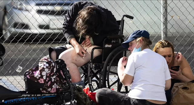 所謂的救助站還沒開幾天,就迅速淪爲了「癮君子」集體注射甚至交易毒品的場所。現場的畫面觸目驚心,在大白天,許多人坐着輪椅、佝僂着身子,仍然手持針管,扎向自己臃腫的大腿或脖子…