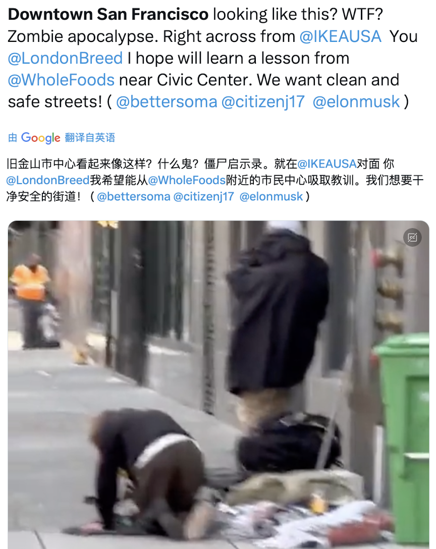 而馬斯克也在前幾天説:「舊金山市中心看起來像殭屍末日,沒去過的人是不知道的。」