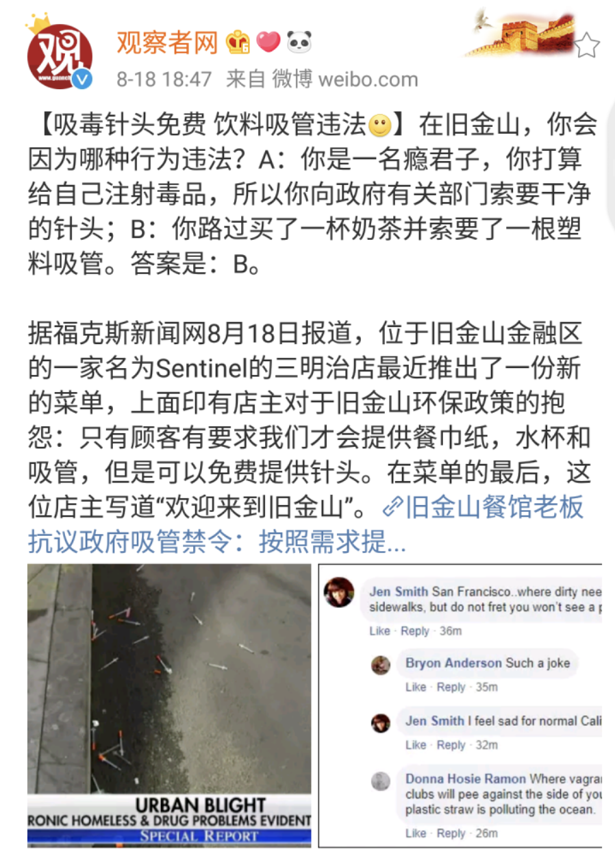 有意思的是,在舊金山吸毒注射的針頭是免費的,但喝飲料用塑料吸管卻可能違反法律。