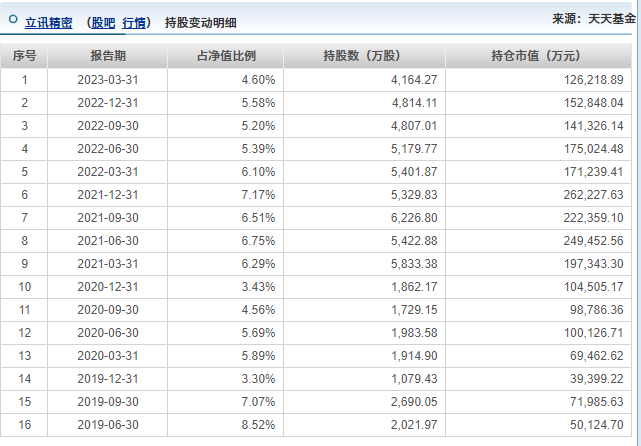 不過由於消費電子在近2年整體低迷,立訊精密表現也屬實一般,在2021年3季度開始,傅鵬博就在一路減持立訊精密。