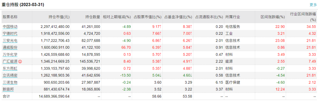 個股的操作方面,趙楓重點減持個股爲美團-W、碧桂園服務、東方雨虹,重點佈局騰訊控股,其中騰訊控股相比2022年年末加倉超155萬股,環比加倉130.01%,從2022年年末的第13大重倉股晉升爲第一季末的第二大重倉股。