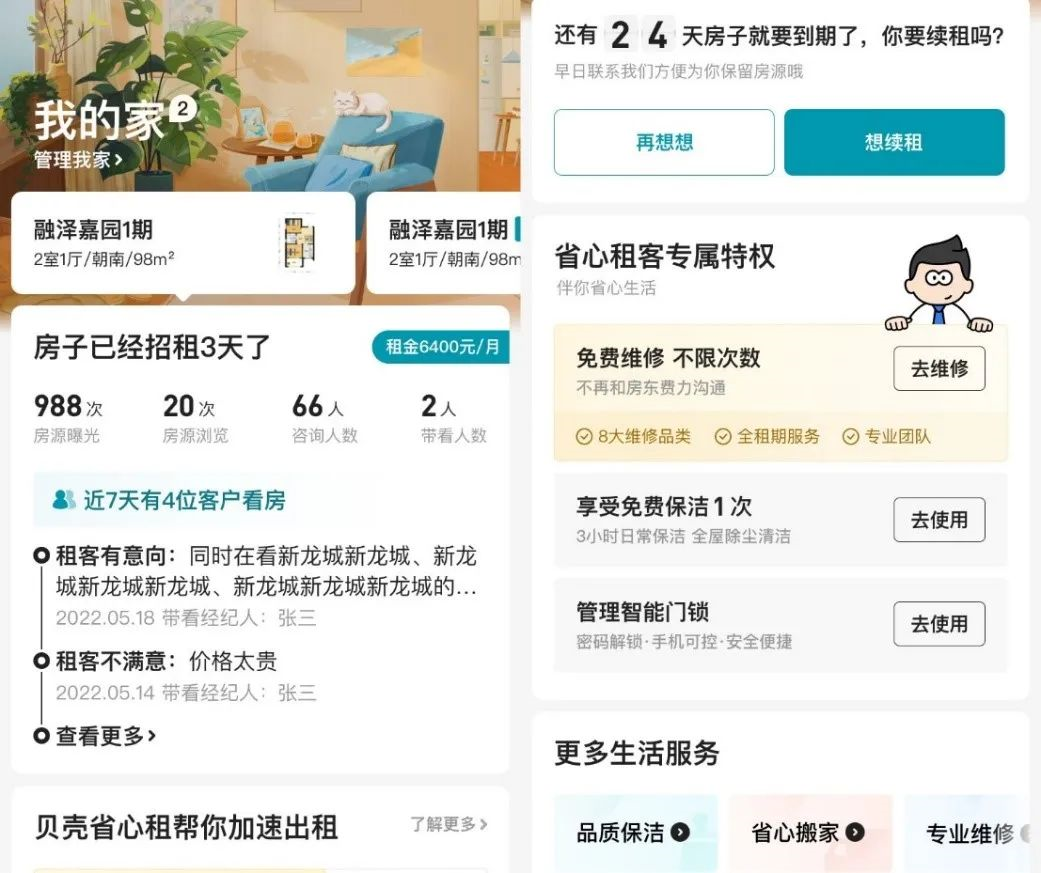 值得關注的是,為方便業主查詢服務進程,「我家」頁面升級還強化了線上服務流程展示,支持交易、出租、出售、裝修服務進度可視化查詢。具體來説,對於購房中業主,支持查看房屋交易的過户、貸款等進度;對於裝修中業主,支持查看裝修每日進度、竣工檔案及聯繫售后;對於租客、出租中業主,支持查看租期、合同、物品交割明細、省心租權益等。