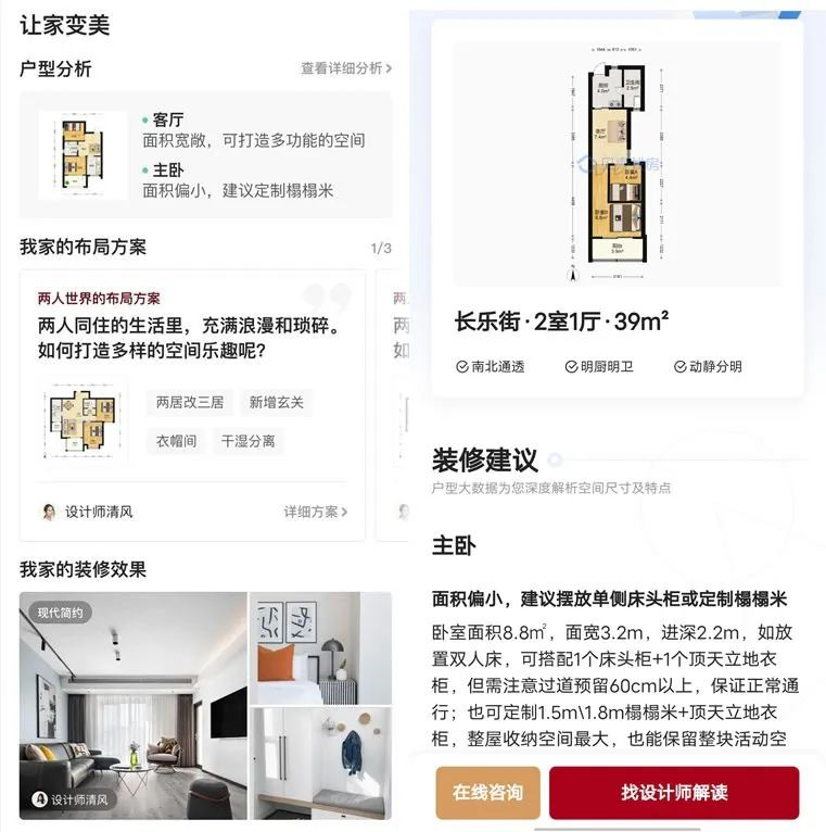 同樣,新版本還特別突出了貝殼的特色服務。比如,聚焦在賣房、出租的「資產管理」模塊,不僅提供了資產報盤與估價服務,還可以直接找到專業的服務者。同樣,聚焦在家裝、家居的「讓家變美」模塊,不僅可以根據房產實際情況為用户提供專屬户型解析和裝修參考方案,還可以提供家裝設計師諮詢。