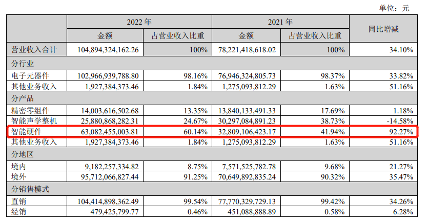 2022年,歌爾智能硬件營收630.8億元,同比增長了92.27%,值得一提的是,智能硬件營收佔歌爾總營收的比重同比提高到了60.14%,上年同期為41.94%,相比之下,過去的營收大頭智能聲學整機業務佔比為24.67%,低於智能硬件的營收。