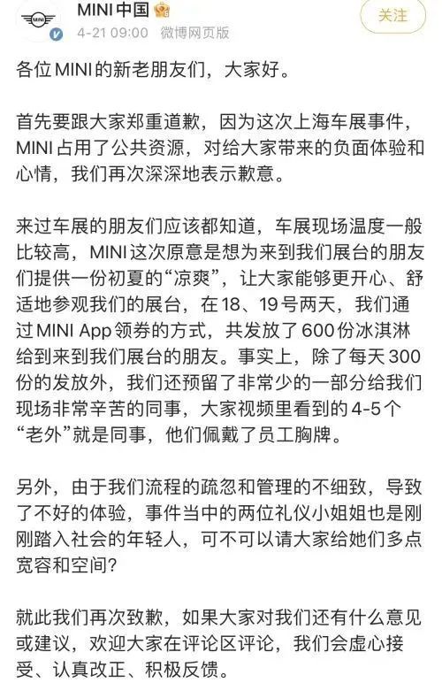 其實回顧寶馬MINI最開始的迴應,已經做出了道歉和承諾整改的表態,靜待風波平息應該是個明智的做法,但偏偏又自覺委屈,想要繼續為自己辯白,但在洶涌的輿情面前,哪里還容得下解釋的空間?