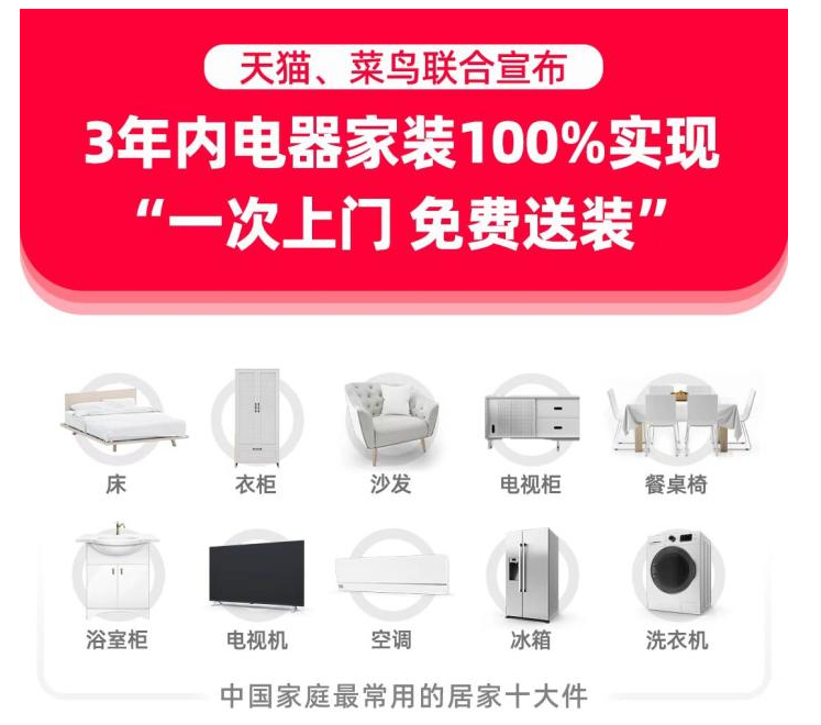 另一方面,相對於京東而言,大件物流一直是淘系電商的短板所在。雖然去年雙11期間天貓喊出,未來3年,消費者在天貓購買衣櫃、牀、洗衣機等大件電器家裝商品,將實現100%「一次上門、免費送裝」的服務。