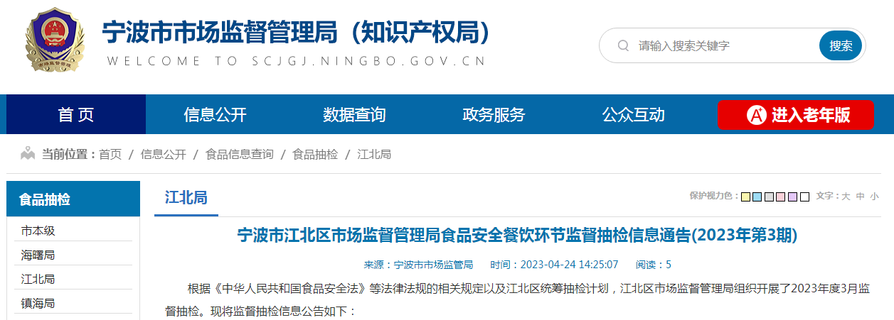 中國質量新聞網訊 近日,浙江省寧波市市場監管局發佈江北區市場監督管理局食品安全餐飲環節監督抽檢信息通告(2023年第3期)。