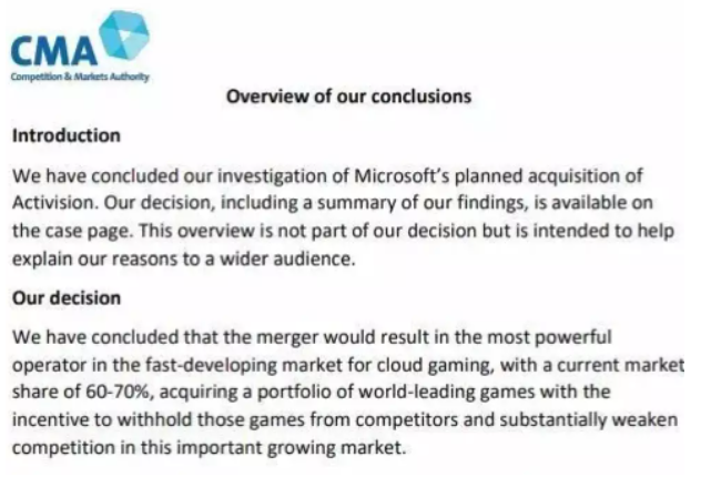 根據CMA公告,本次英國當局否決微軟收購動視暴雪案,主要原因是:CMA認為,微軟在雲遊戲服務市場擁有極其強大的地位,目前佔有60%到70%的雲遊戲市場。如果收購成功,微軟將獲得如《使命召喚》《守望先鋒》《魔獸世界》等重點產品的控制權,將對其雲遊戲服務產生商業優勢。