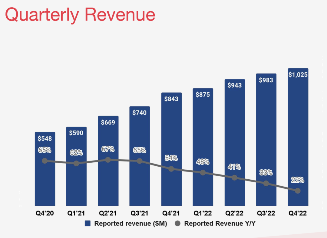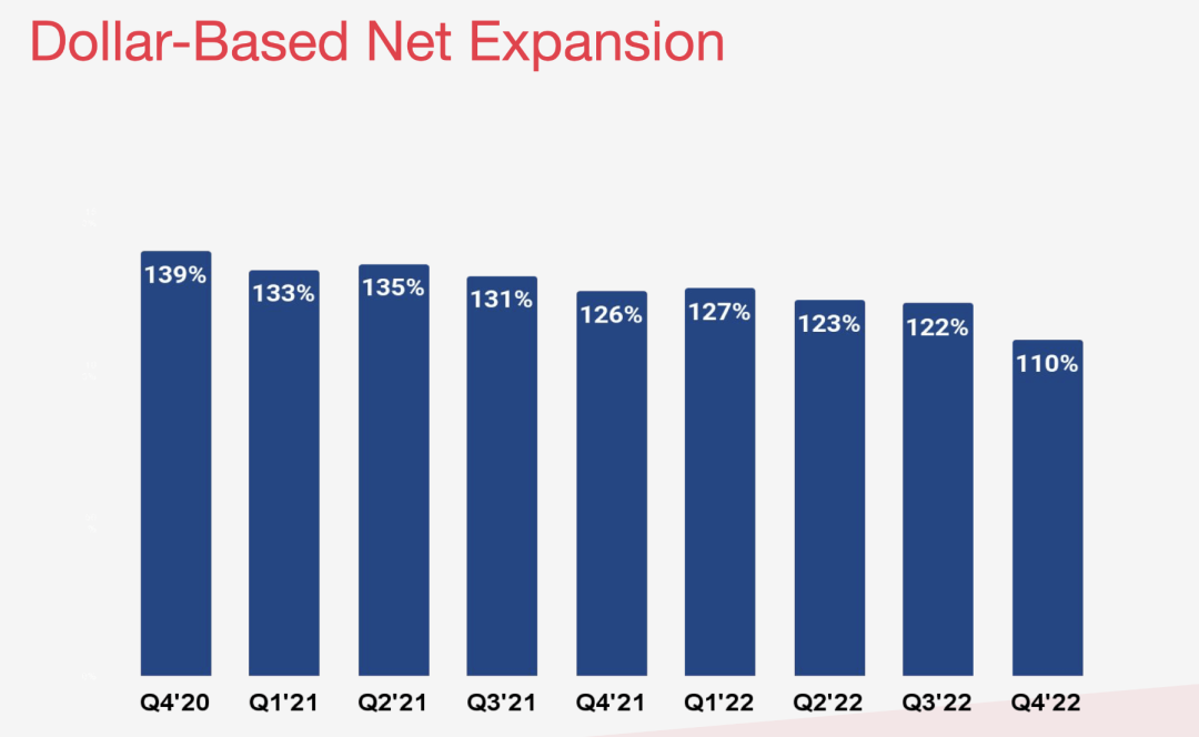 TWLO 的大部分業務也是基於使用量的,因此在經濟疲軟時期,使用量肯定會下降。其以美元為基礎的淨保留率在第四季度為 110%,雖然仍然穩健,但遠低於歷史下降水平。上一季度為 122%,而 2020 年第四季度則高達 139%。