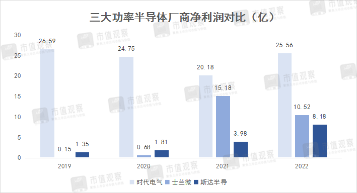 而另外兩家涉及領域較多,業績影響因素也較多。如士蘭微,除了分立器件,還有集成電路和發光二極管業務,分立器件營收佔比剛剛過半。2019-2020年其淨利潤表現較差,主要在於LED行業的不景氣,2021年隨着行業回暖及分立器件業務的快速發展才使得淨利潤大漲。但2022年淨利潤再次下降超30%,主要與原材料供應不足、下游家電等消費市場低迷有關。