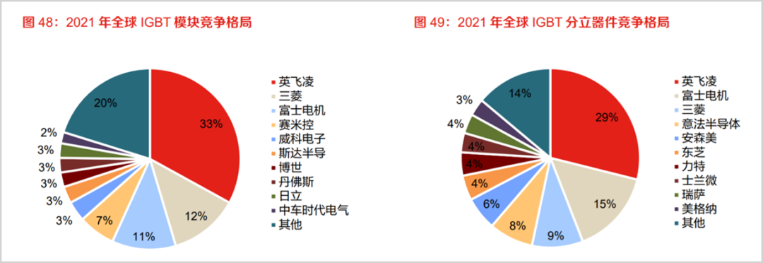 從全球競爭格局看,據東方證券數據,2021年全球IGBT模塊前五大廠商佔據了67%的市場份額,其中英飛凌佔比達33%,國內的斯達半導和時代電氣分別僅為3%和2%;在整體分立器件上,英飛凌同樣穩居榜首,士蘭微則佔4%排在第八。