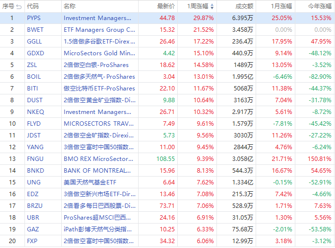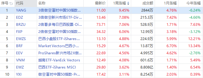 此外,本周做空新興市場ETF佔據漲幅榜強勢位置。3倍做空新興市場ETF $EDZ 和ProShares新興市場2X做空 $EEV 分別周漲7.08%、4.56%,位列第二和第七位。