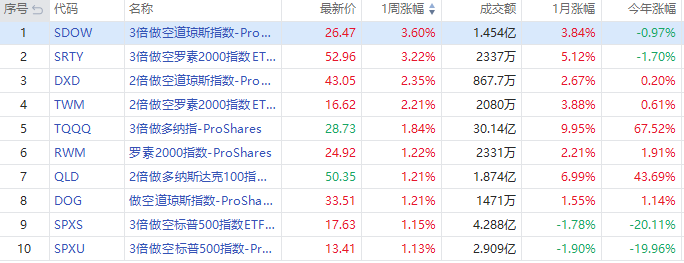 指數ETF方面,本周漲幅居前的為做空類ETF。其中,3倍做空道瓊斯指數ETF $SDOW 、2倍做空羅素2000指數 $SRTY 、2倍做空道瓊斯指數ETF $DXD 、3倍做空標普500指數ETF $SPXS 分別周漲3.6%、3.22%、2.35%、1.15%。