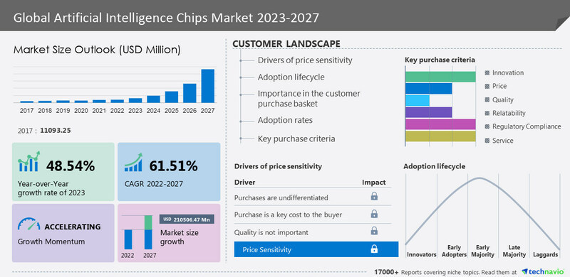 知名市場研究機構Mordor Intelligence 預測,到2028年,企業人工智能市場的總規模將以每年52%的速度快速增長。市場調研機構Technavio 在4月公佈的一份最新研報顯示,人工智能 (AI) 用途芯片的市場規模預計在2022-2027年期間以高達驚人的61.51%的複合年增長率爆炸式增長。