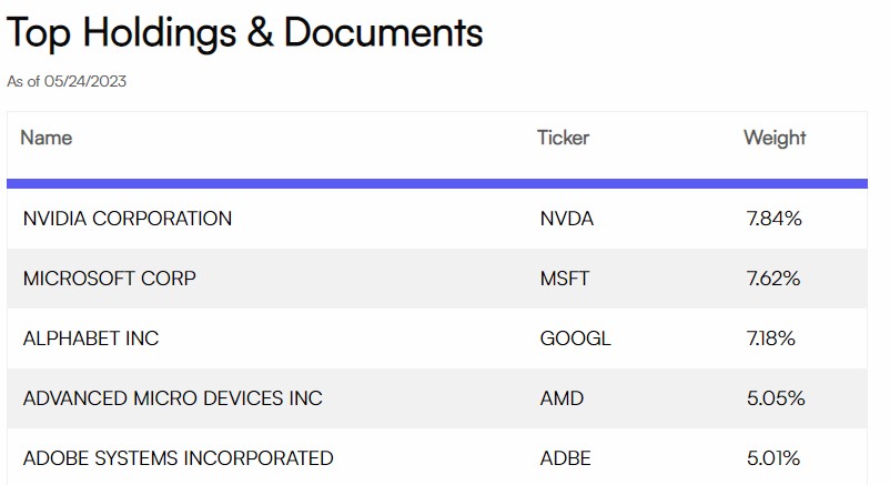 目前,該ETF已持有32家公司,其中前十大公司佔持倉的56.9%。排名第一的是英偉達,微軟緊隨其后,第三、四位為谷歌母公司Alphabet和AMD,這些受益於AI投資狂潮的「AI科技股」今年以來的表現極其出色。