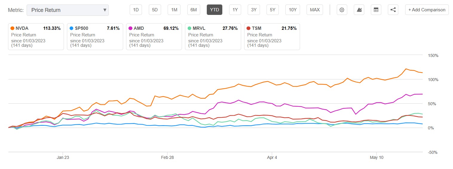 因此,從英偉達第一財季的財報和指引我們能夠看出,人工智能(AI)GPU芯片在內的高性能產品需求持續暴增,這表明英偉達、AMD(AMD.US)、臺積電(TSM.US)和邁威爾科技(MRVL.US)等AI硬件相關的芯片公司可能繼續從ChatGPT和微軟必應AI聊天機器人等火爆全球的AI軟件,以及從全球佈局AI的浪潮中持續受益。