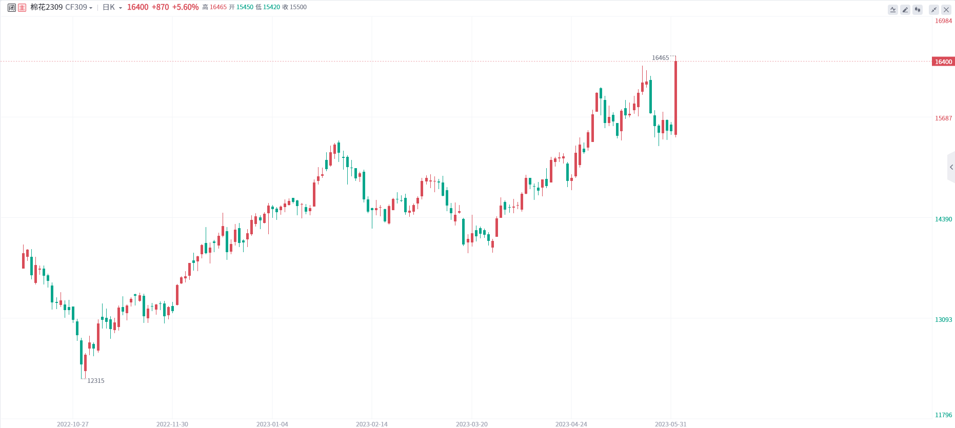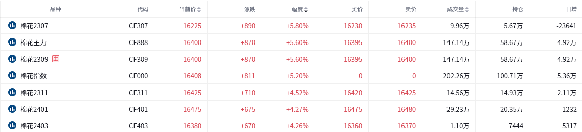 截至6月1日15點收盤,鄭商所棉花期貨合約全線上漲。其中主力合約CF309收盤為16400元/噸,漲幅5.60%,合約持倉量今日增加4.92萬手至58.67萬手。