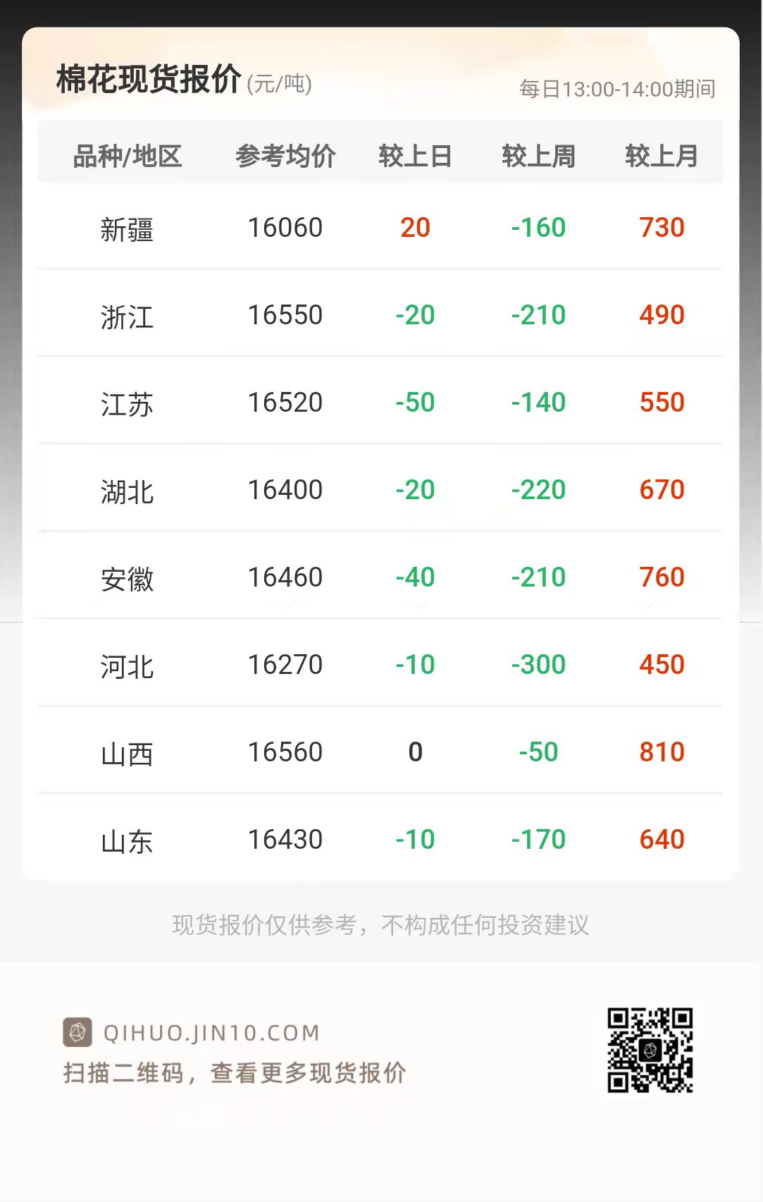 據金十期貨APP現貨報價顯示,今日棉花現貨價格漲跌不一,現貨價格漲跌幅在-50—20之間。