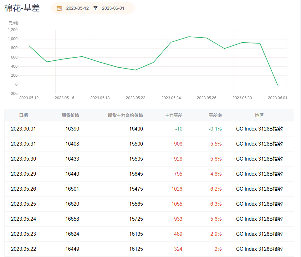 據金十期貨APP基差日曆,今日棉花期貨主力合約CF309期價基差為-10元/噸,較上一交易日大幅下降,基差率從5.5%下降至-0.1%。