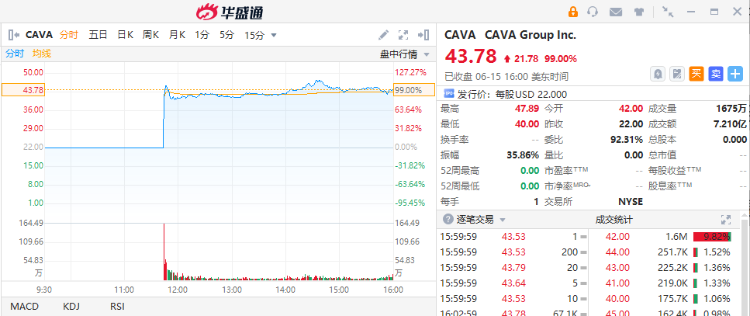 周四,地中海風格連鎖餐廳Cava集團股份正式登陸美股,上市首日漲幅達到99%,收盤股價為美股43.78美元,全天成交額7.21億美元。