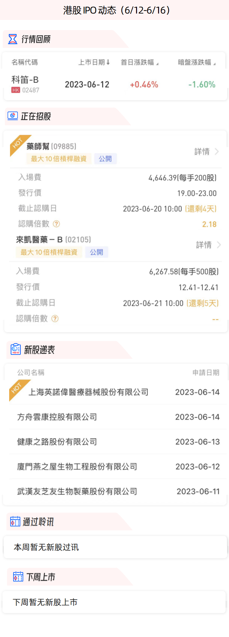 公司於6月15日起至6月20日公開招股,發售價為每股19-23港元,一手入場費4646.39港元,預期將於6月28日掛牌上市。目前孖展倍數為2.18。