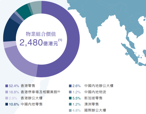 領展房地產投資信託基金,擁有一個包括位於香港、北京、上海及廣州之零售商鋪、停車場及辦公室物業的多元化物業組合。