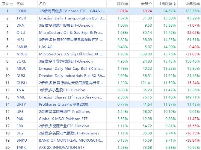 從美股ETF漲幅榜來看,本周由於加密貨幣行情回升,比特幣價格正徘徊在一年高點附近,帶動交易所Coinbase大漲,導致1.5倍每日做多CoinbaseETF跟漲24.57%。美國整體的經濟及樓房數據皆優於預期,3倍做多房地產股票ETF、2倍做多美國房地產-ProShares本周分別漲15.38%、10.1%。
