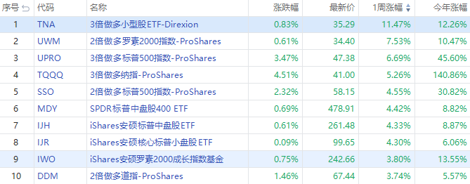 指數ETF方面,本周漲幅居前的為做多中小盤股ETF。其中,3倍做多小型股ETF-Direxion $TNA 、2倍做多羅素2000指數-Proshares $UWM 累計漲11.47%、7.53%;SPDR標普中盤股400 ETF $MDY 、iShares安碩標普中盤股ETF $IJH 、ishares安碩核心標普小盤股 ETF $IJR 等皆漲逾4%。