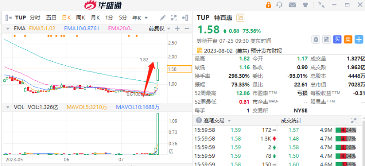 身處破產邊緣的家居用品品牌特百惠,昨日盤中一度放量暴漲104%,尾盤迴落收漲75%,近兩日升幅超過140%。該股消息面並沒有任何信息,公司也沒有向SEC解釋大幅上漲的原因,但近期空頭在大舉加註公司破產。