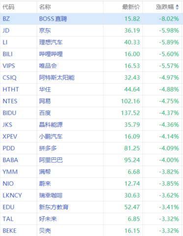 華盛資訊8月11日消息,熱門中概股集體下跌,截至發稿,Boss直聘跌超8%,京東、理想汽車、嗶哩嗶哩跌超5%,網易、百度、小鵬汽車、拼多多跌超4%,滿幫、蔚來、瑞幸咖啡跌超3%。