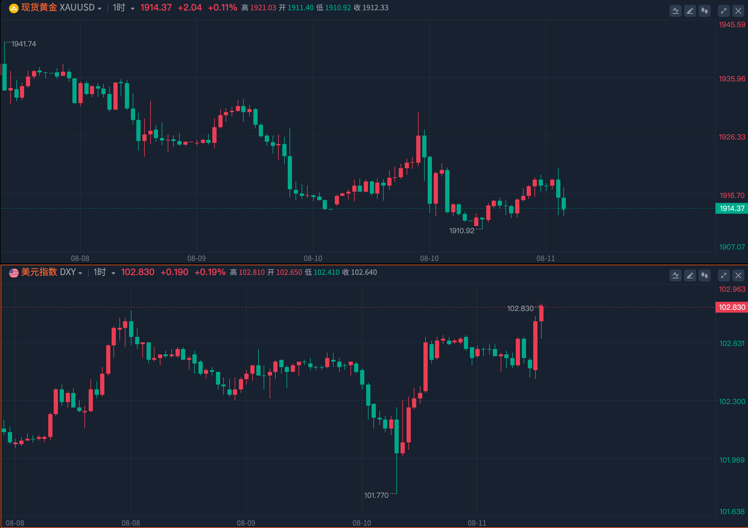 本周,現貨黃金整體震盪走低。周四,受低於預期的通脹數據提振,金價一度漲至1930.19美元的日內高點,但隨后逆轉漲勢,加速跌破1920美元整數關口,最低觸及1910.92。