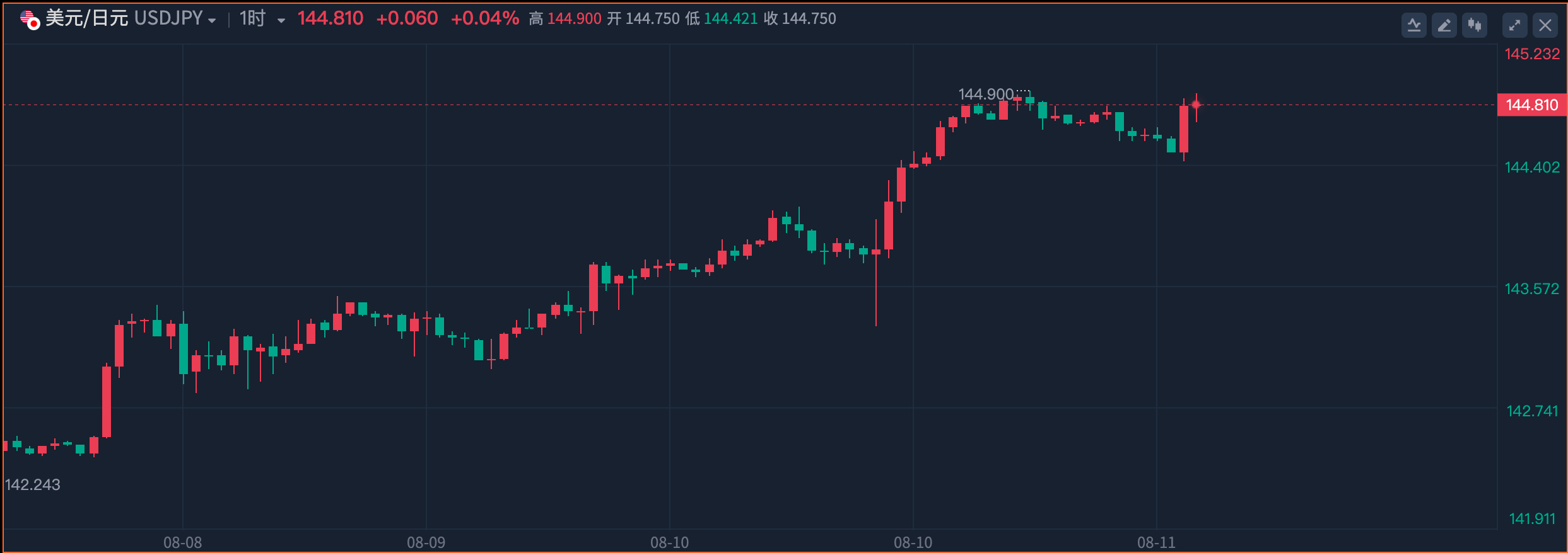 因交易量減少和利差持續擴大,美元兑日元本周一路走高,最高觸及144.90,刷新五周高位,再度引發市場對日本央行再次出手干預的猜測。