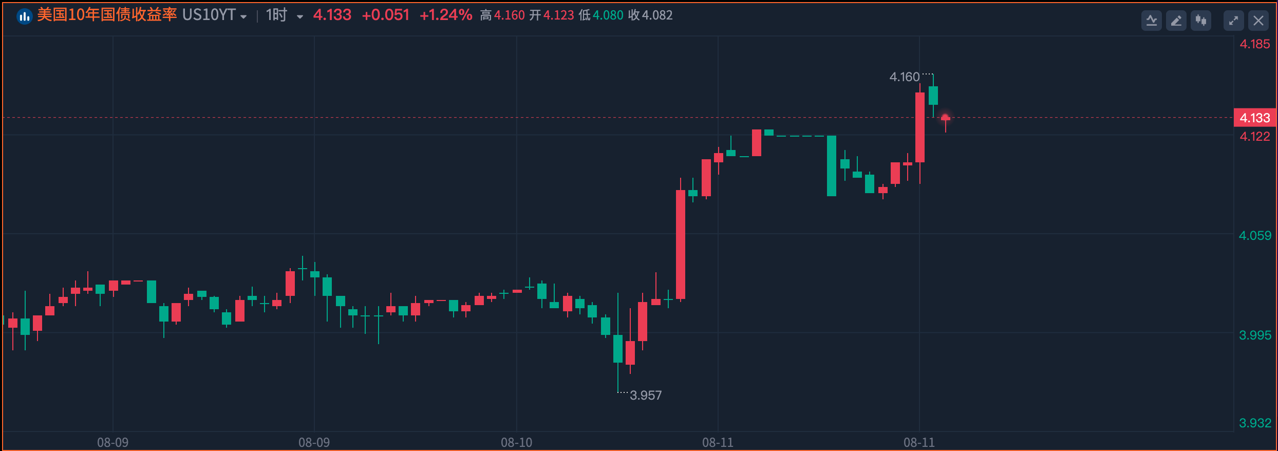 受通脹數據、30年期美債標售遇冷影響,十年期美債收益率周四明顯上升,周五PPI數據后最高觸及4.16%,隨后有所回落。