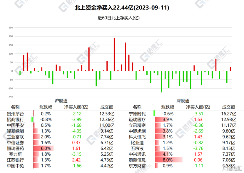 9月11日,北向資金全天淨買入22.44億元。其中,滬股通淨買入12.33億元,深股通淨買入10.11億元。
