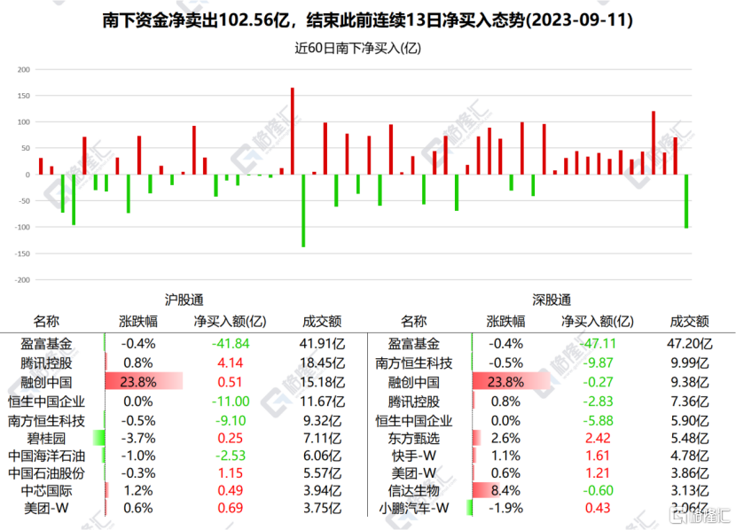 南向資金淨賣出102.56億港元。其中,港股通(滬)淨賣出50.60億港元;港股通(深)淨賣出51.97億港元。