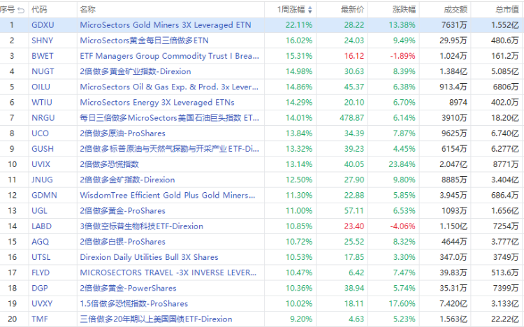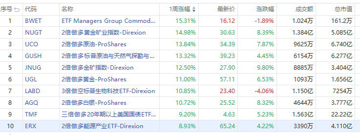 從美股ETF漲幅榜來看,黃金、原油相關ETF佔據周內漲幅榜。受巴以衝突影響,全球資產避險情緒升溫,國際金價 $GCmain 周內暴力反彈5%,3倍做多小型金礦ETF $GDXU 周內暴漲22.11%,此外還有 $SHNY 、 $NUGT 漲幅高達15%。