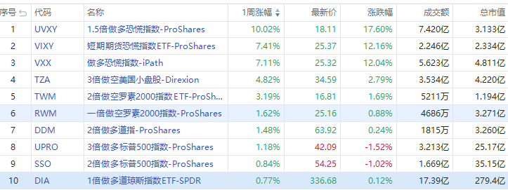 美股小盤股ETF本周再遭市場拋售,3倍做空小盤股ETF $TZA 漲超3%,上周該ETF大漲6.66%。此外,2倍做多道指 $DDM 、三倍做多標普500 $UPRO 周漲超1%。