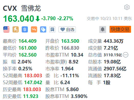 雪佛龍(CVX.US)跌2.27%,報163.04美元。雪佛龍周一(23日)表示,同意以530億美元全股票交易收購Hess(HES.US),為繼埃克森美孚本月初以600億美元收購先鋒自然資源公司之后美國最大石油公司之間的第二次大型合併。