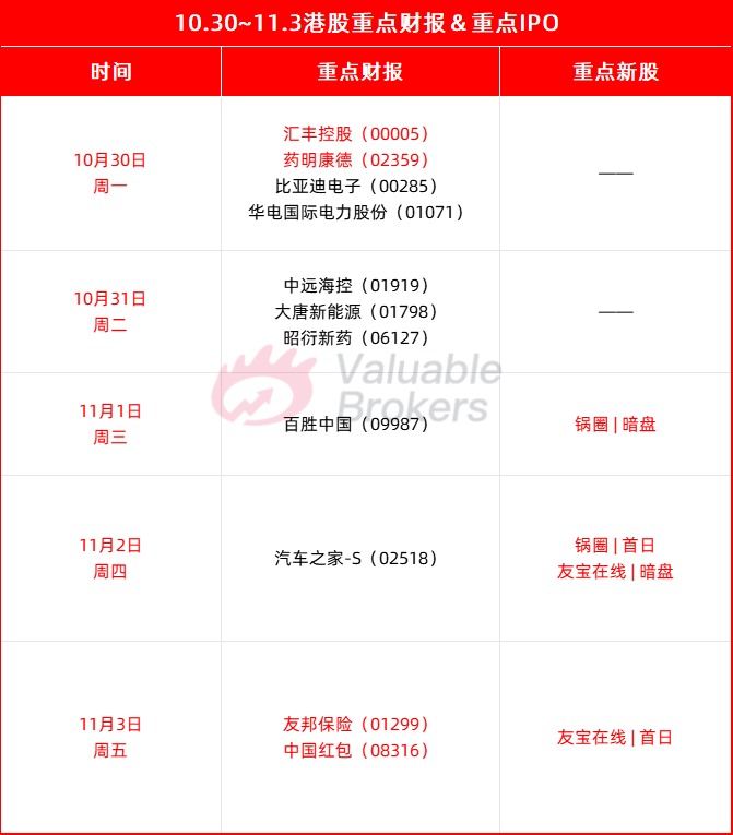 港股新股方面,鍋圈預計11月2日上市;國內最大自動售貨機經營商,友寶在線將於11月3日上市。