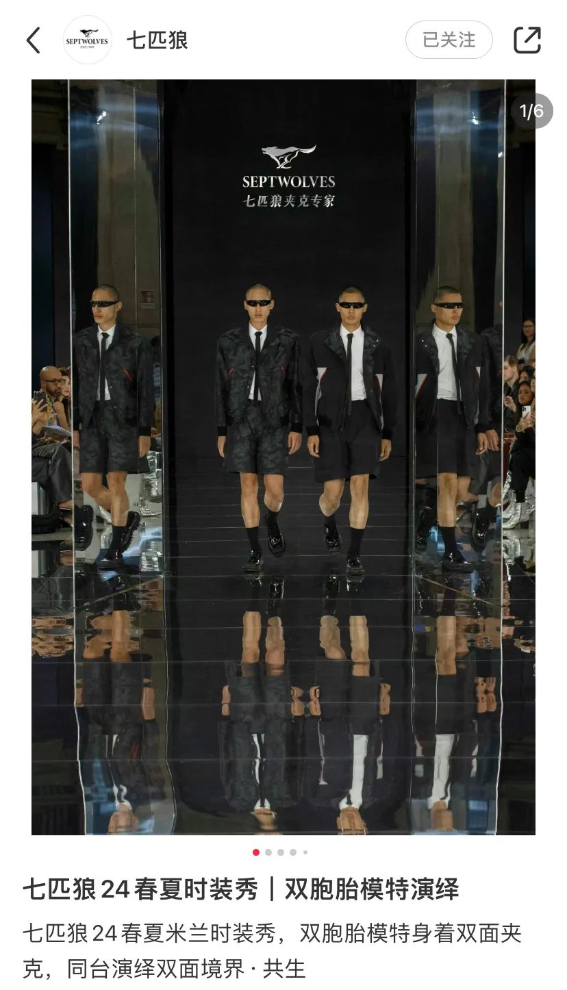 在明星和熱點的共同加持下,直播當天,七匹狼直播間聚集了大量觀看用户,萬人將目光投射到米蘭市中心的Galleria Meravigli畫廊里。七匹狼基於本次主題「雙面境界·共生」,在秀場上運用了大量鏡面立體裝置,還邀請了雙胞胎模特同台走秀。