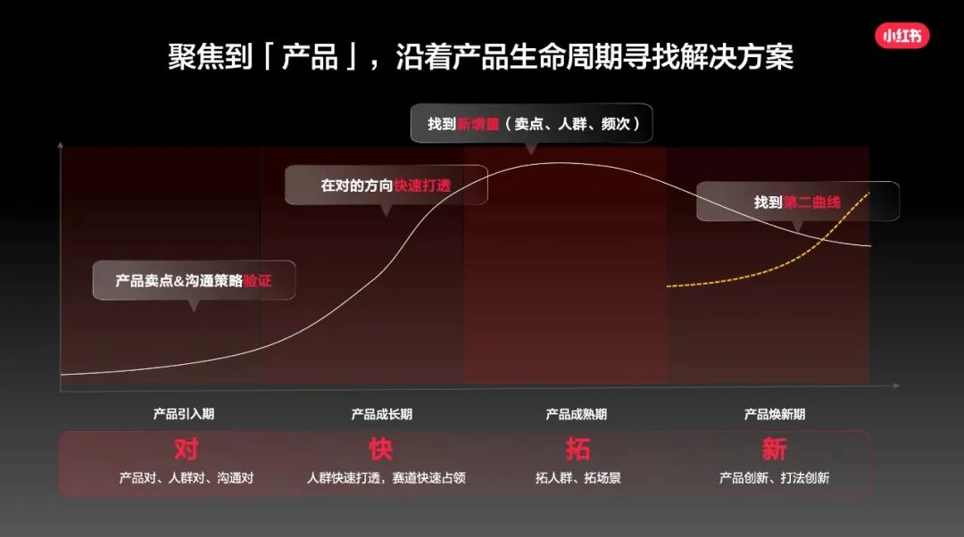 同時,小紅書商業化團隊也形成了產品全生命周期解決方案,不只是針對於經典品牌的營銷訴求,小紅書商業化可以幫助處於不同產品生命周期的品牌做好營銷。比如在產品引入期,小紅書幫品牌做好驗證,做到「產品對、人羣對、溝通對「;新品獲得市場認可進入快速成長期,小紅書助力品牌在對的方向上快速打透核心人羣,佔領賽道......