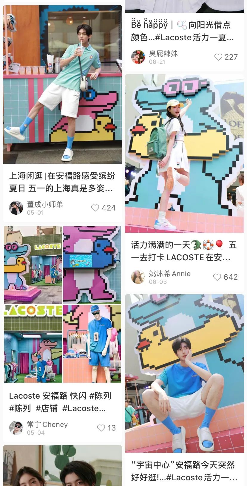 同時,Lacoste還將品牌快閃店搬到安福路街道上順勢推出夏日限定新品。快閃店門口像素風的粉色衝浪小鱷魚裝置拍照十分出片,不少遊客和粉絲前來打卡,甚至明星曾舜晞也前去購物。這些高顏值的探店物料通過小紅書博主和素人的筆記返回線上擴散之后,Lacoste的形象在更多人心中從中年大叔標配變成了一隻萌萌的、潮流的小鱷魚。