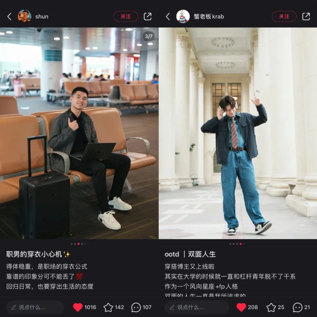 例如穩重氣質的博主@shun演繹了「職男的穿衣小心機「,商務出差帶一件夾克就夠了,見客户穿商務面,工作間隙還能換成休閒面去逛街喝個咖啡。風格更為街頭潮流的博主@蟹老闆krab則把這款雙面夾克穿出了一股大學學長風,青春氣息撲面而來。