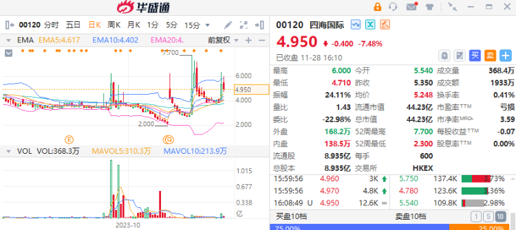 11月27日,四海國際盤中一度暴漲超過60%,成交額較此前交易日大幅增長。截至收盤,漲37.53%,報5.35港元,成交額5137.82萬港元。