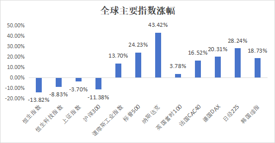 截至2023年12月31日,恆生指數年內下跌13.82%、恆生科技指數下跌 8.83%。同期,A 股市場,上證指數下跌3.70%、滬深300下跌11.38%;美股市場,道瓊斯工業指數上漲13.70%、標普500 指數上漲 24.23%、納斯達克指數大漲43.42%。2023 年,在全球主要股市中,港股市場表現靠后。