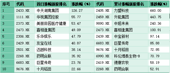 上市首日表現最好的是中天湖南集團(2433.HK),錄得漲幅126%,其次是華視集團控股(1111.HK)和美麗田園醫療健康(2373.HK);累計漲幅表現最好的是力盟科技(2405.HK),累計漲幅達到660%,升能集團(2459.HK)和中旭未來(9890.HK)也錄得444%和240%的漲幅。