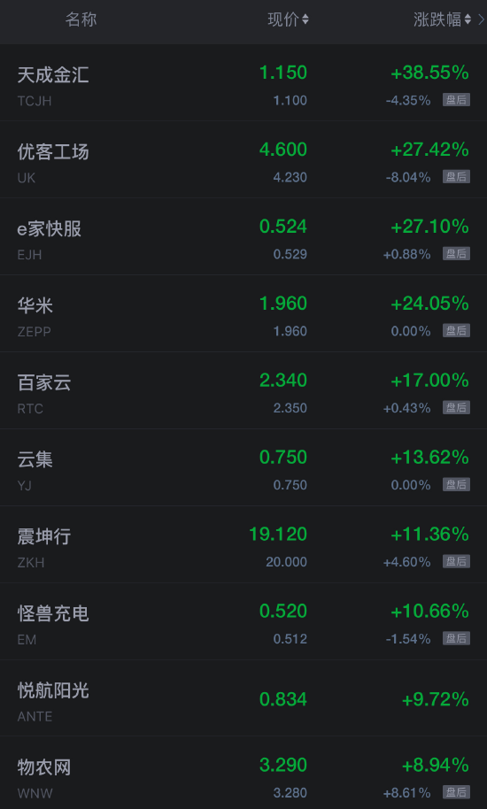 天成金匯漲超38%,優客工場,e家快服,華米等漲超20%,百家雲,雲集,震坤行,怪獸充電等漲超10%,悦航陽光,物農網等漲超8%。