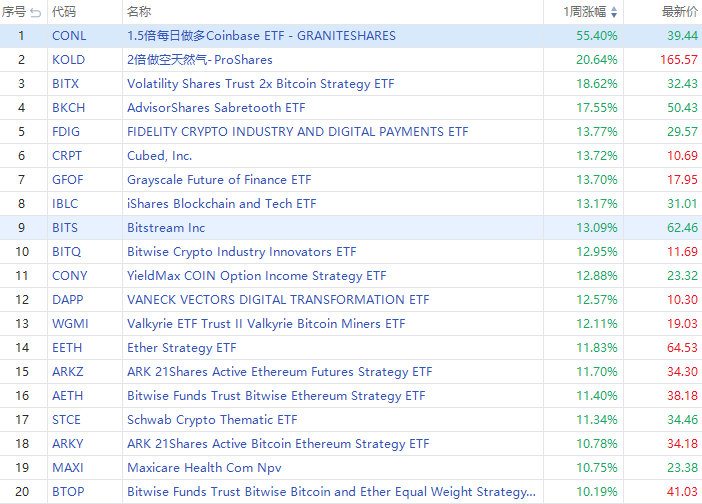 編者按:加密貨幣市場表現狂熱,CONL周漲超55%;降息預期再遭重錘,SQQQ一周大漲超4%;中東風險溢價上升,2倍做多美國油氣指數周漲超5%。