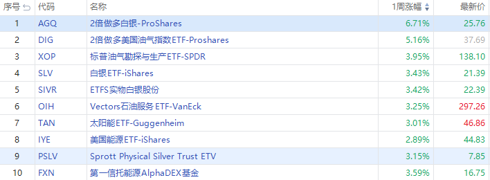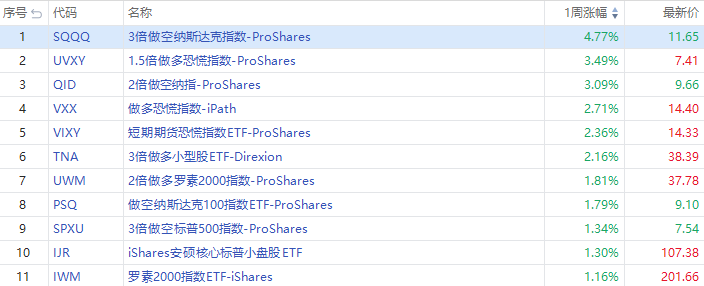 指數ETF方面,本周做多恐慌指數相關ETF領跑,1.5倍做多恐慌指數-ProShares一周漲超3%,短期期貨恐慌指數ETF-ProShares、做多恐慌指數-iPath一周漲超2%。
