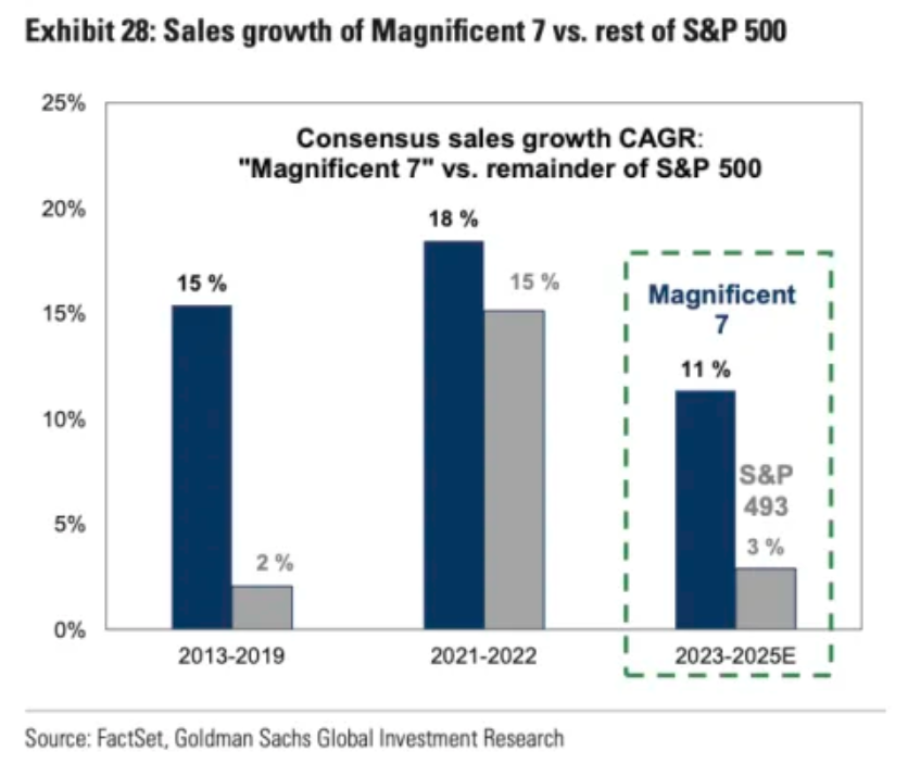 從年複合增速(CAGR)來看,從2013年到2019年「七大科技巨頭」整體銷售額CAGR高達15%,而其他股票的年複合增長率為2%。這一差距在2021到2022年一度收窄。但是高盛的策略師們預計,從2023年到2025年,「七大科技巨頭」整體銷售額的複合年增長率將達到11%,而標普500指數其他成份股的複合年增長率僅為3%。